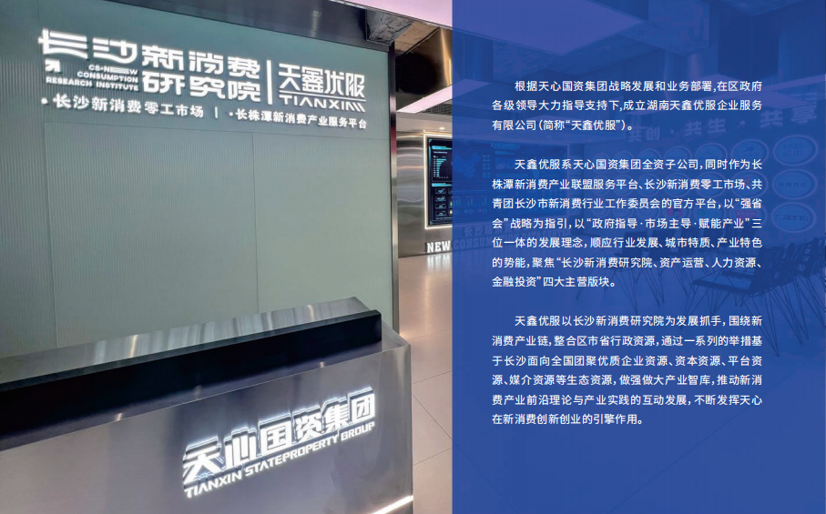 2022年10月31日,由湖南省商務廳指導、長沙市商務局和天心區(qū)人民政府共同發(fā)起,正式授牌長沙新消費研究院,由天心國資集團全資企業(yè)湖南長沙新消費產(chǎn)業(yè)研究有限公司運營。