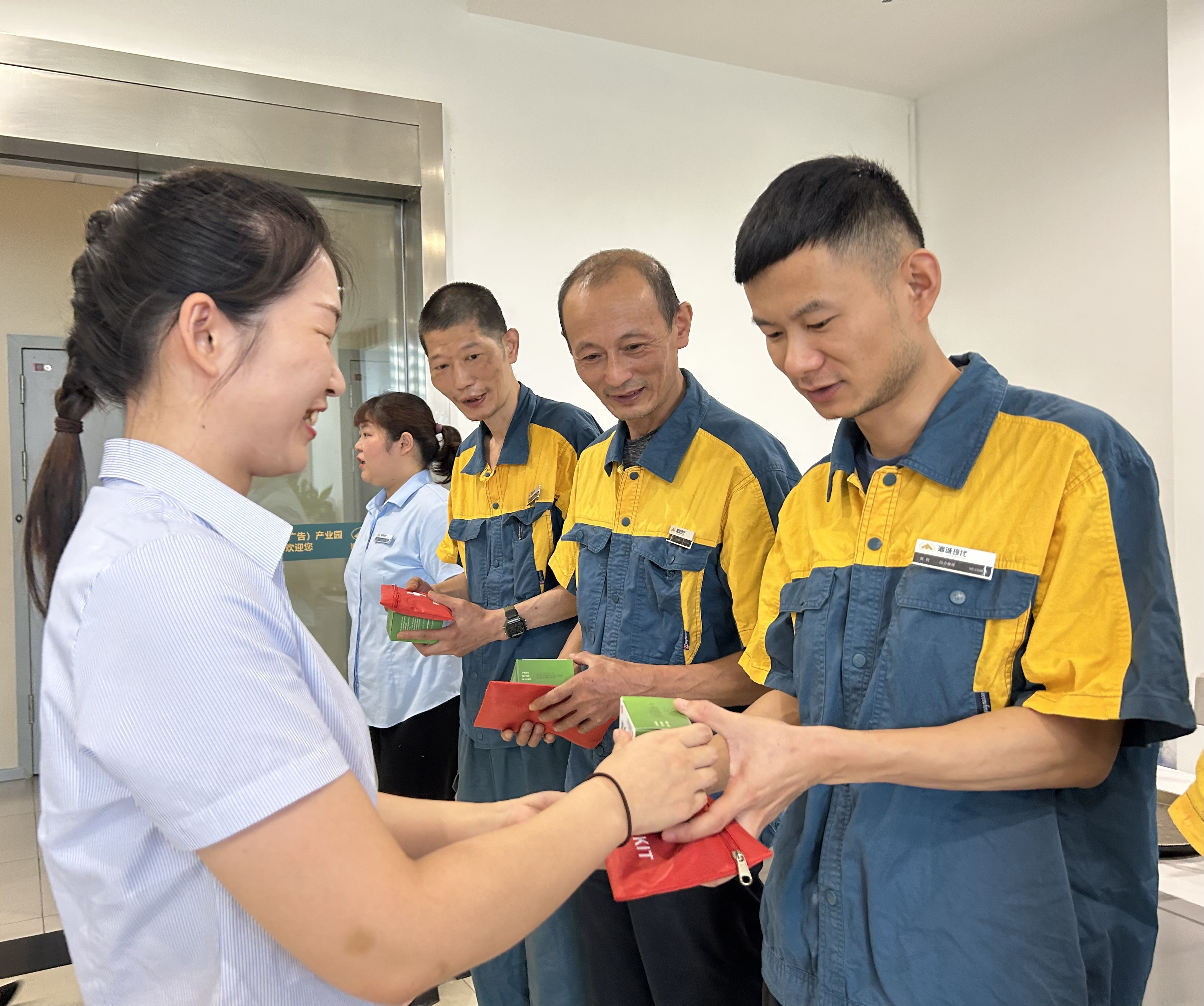 為了表達(dá)對一線員工的敬意和關(guān)懷,項(xiàng)目部的醫(yī)藥箱給大家長期儲備清涼油、藿香正氣水等降溫藥品,也會在下午給班組發(fā)放冰礦泉水、西瓜等。同時(shí)根據(jù)近段時(shí)間的高溫天氣,公司綜合管理部為每位員工配置了高溫防暑包,并逐個(gè)發(fā)到職工手中,緩解他們在高溫環(huán)境下的勞累。