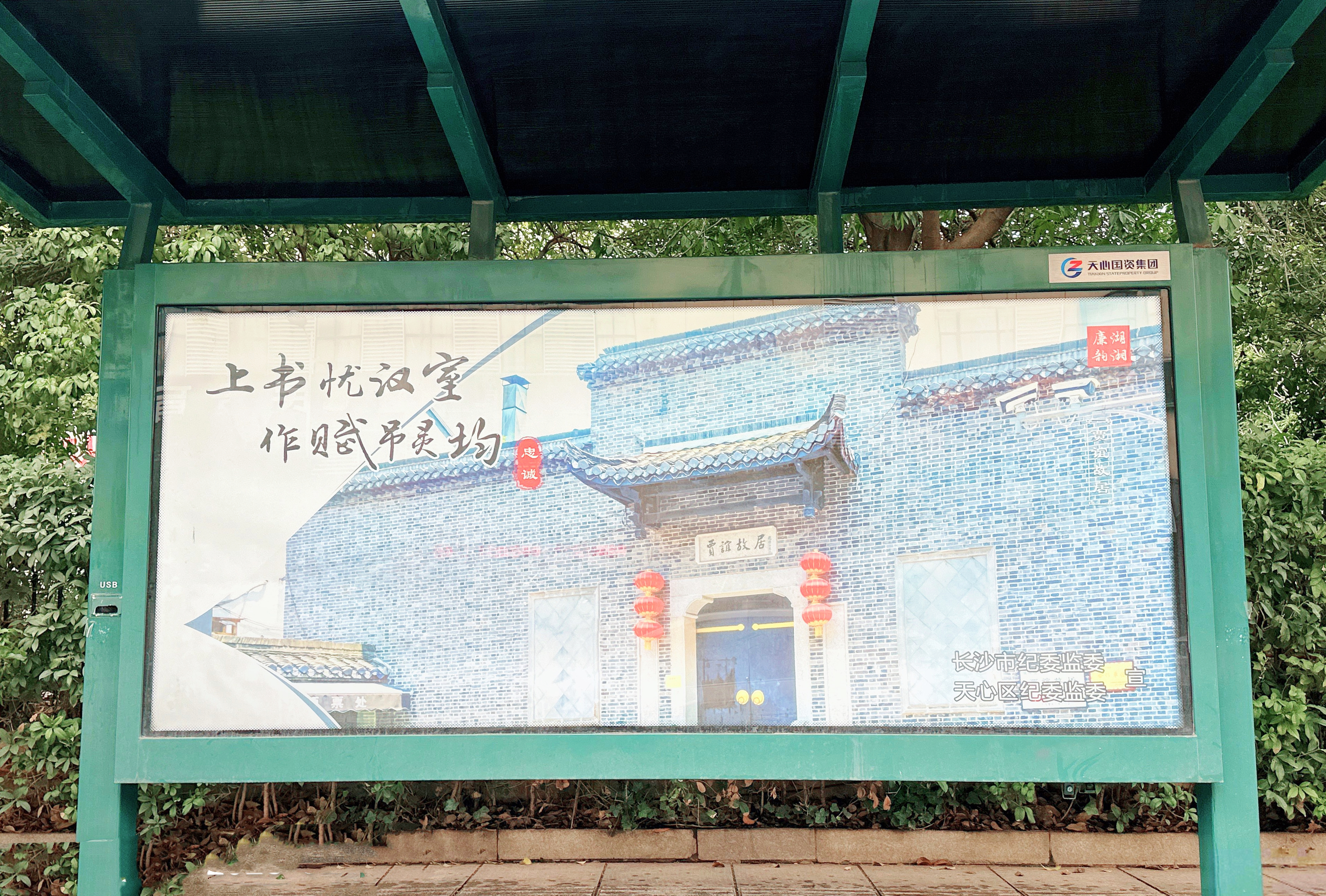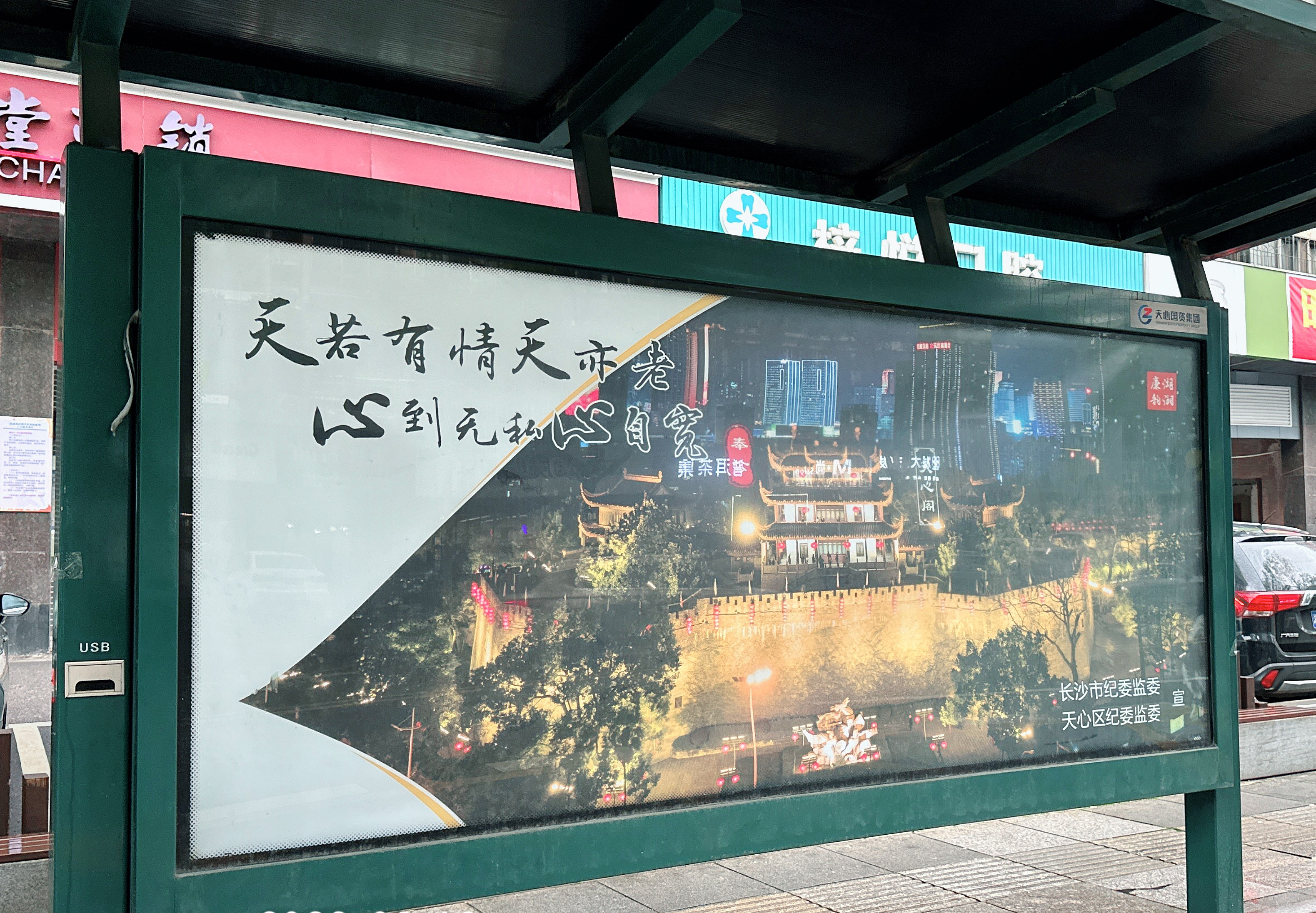 “天若有情天亦老,心到無(wú)私心自寬”?!苯?,在天心區(qū)白沙廣場(chǎng)候車(chē)亭,正在等公交車(chē)的李大爺被一幅宣傳畫(huà)吸引,他喃喃地念著,聲旁的孫子說(shuō):“爺爺,這是我們之前去過(guò)的天心閣,真漂亮啊。”